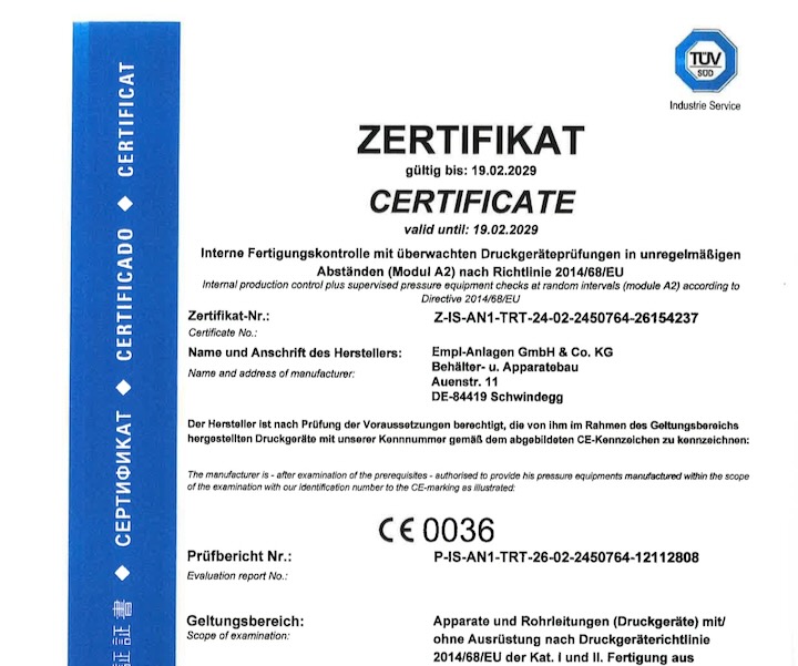Allgemein 03 März 2026 Februar 2026: Erfolgreiche Zertifizierung nach Druckgeräterichtlinie 2014/68/EU (Modul A2) Die Empl Anlagen GmbH & Co. KG hat die turnusmäßige Überprüfung durch den TÜV SÜD im Rahmen der Internen Fertigungskontrolle mit überwachten ... Empl Anlagen